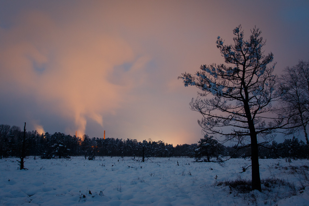 Jetzt schneit es doch noch. Bevor der Schnee wieder taut, bin ich gleich am Abend noch ins Ried gefahren und habe dort meine Eindrücke eingefangen. Zugleich ist dies mein erster Besuch am Abend hier. Das nahegelegene Industriegebiet sorgt für eine interessante Ausleuchtung.